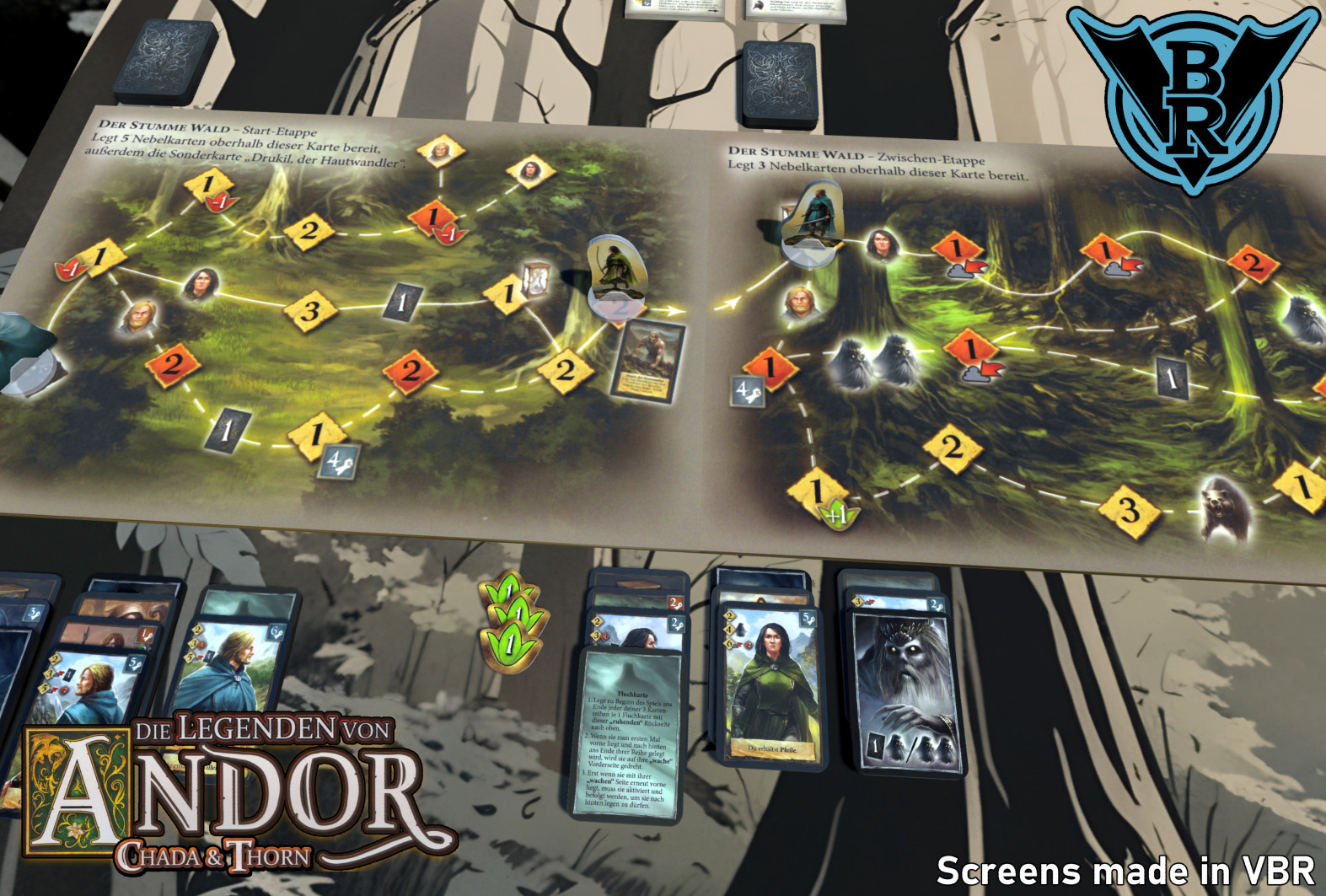 Chada und Thorn können sich mit ihren Aktionen bewegen, gegen Feinde kämpfen oder Sonderaktionen ausführen. Dabei geht es immer darum, dass keine der Deckreihen blockiert wird und der Fluch einen auf dem Pfad nicht ein- oder überholt. In den vier Grundkampanien, gibt es zudem immer eine interessante neue Spielmechanik, welche die Grundregeln aufgreift, erweitert und anpasst, so das es von den Sturmweiden über den stummen Wald, bis hin zu den Mauerbergen nie langweilig wird.