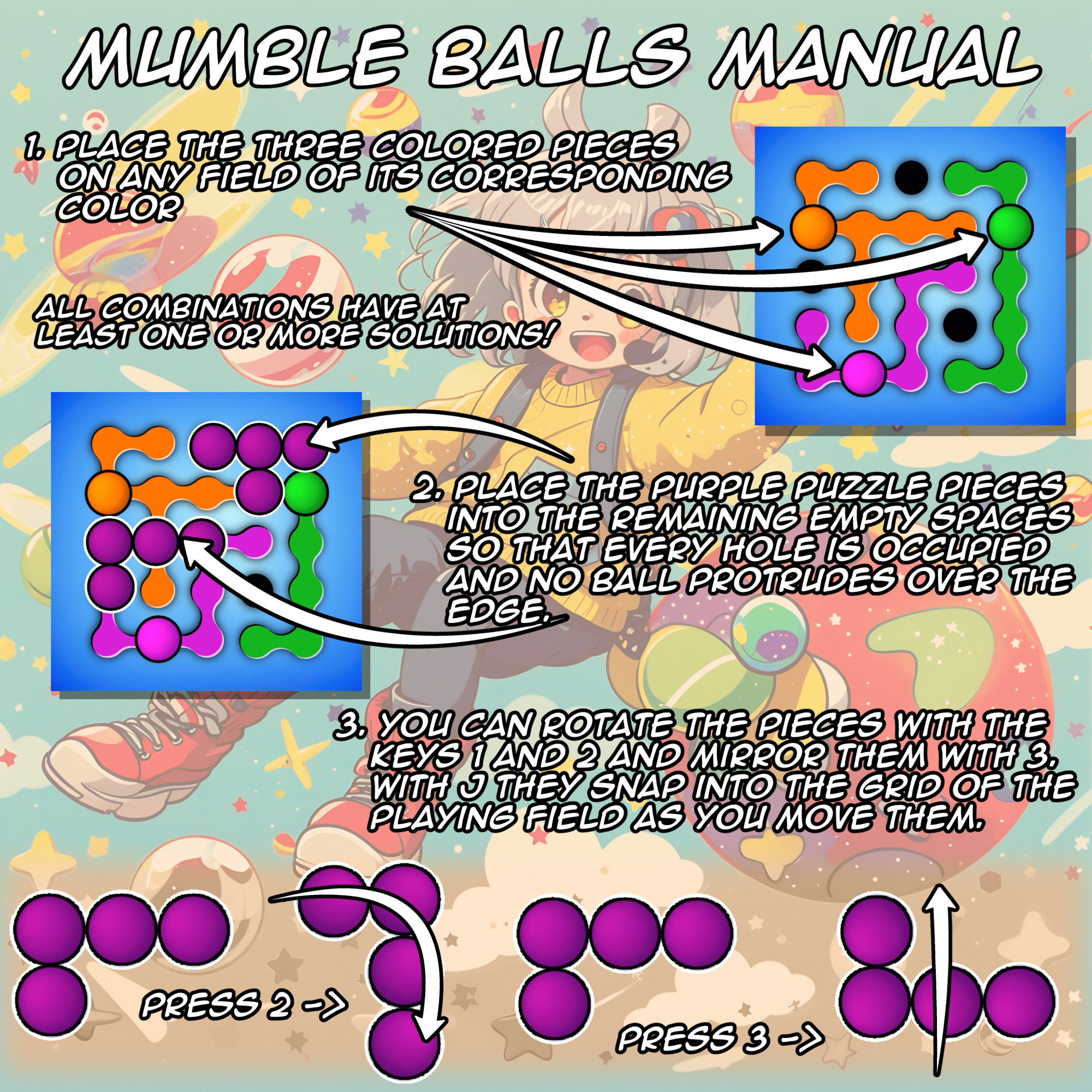 The aim of each round is to arrange all the spherical puzzle pieces in the main field. The three colored balls constantly create new possibilities. If you find several solutions to a puzzle, how many are there at most?