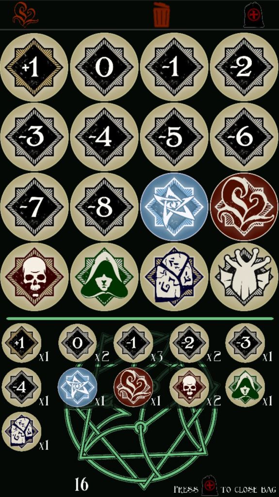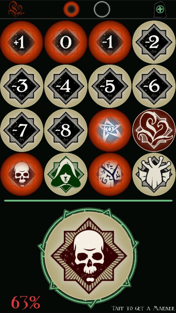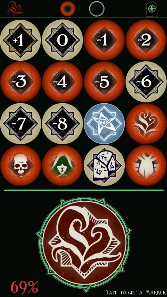 Dieses kleine Tool ist kein Spiel im eigentlichem Sinne. Es ist für das „Living Card Game“ Arkham Horror LCG gedacht und soll die Spieler beim ziehen von Modifikationsmarken aus einem Beutel, dem ~Chaos Bag~, unterstützen. Dabei ist die App wie der Beutel der dem Spiel beiliegt gestaltet. Man kann den Sack mit entsprechenden Chips befüllen und sie danach zufällig wieder ziehen. Außerdem kann man sich die Wahrscheinlichkeit mit der man einen bestimmte Chip, oder einen besseren, zieht, in Prozent anzeigen lassen.